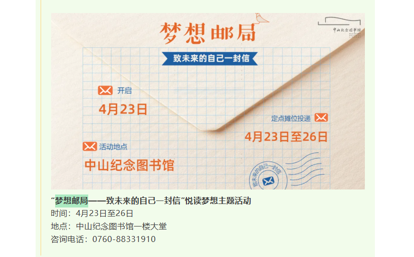 4月1日,記者從中山紀(jì)念圖書館獲悉,在第31個(gè)世界讀書日來臨之際,我市全民閱讀活動(dòng)周將于本月23號(hào)到26號(hào)舉行。本次活動(dòng)由中共中山市委宣傳部主辦,中山紀(jì)念圖書館協(xié)辦。活動(dòng)期間將推出“圖書館之夜”、夢想郵局、百人齊誦、普特兒童融合閱讀、銀齡共讀等一系列特色鮮明、覆蓋全年齡段的閱讀文化活動(dòng)。