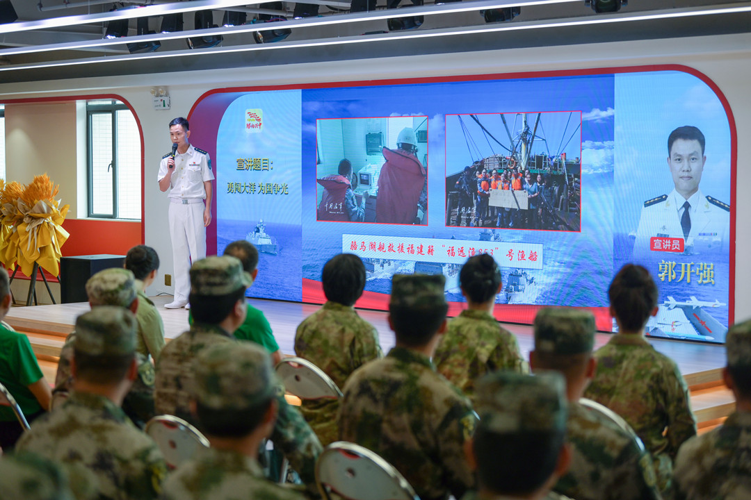 郭開強(qiáng):勇闖大洋 為國爭光 2008年12月,應(yīng)聯(lián)合國授權(quán)請求,奉中央軍委命令,南海艦隊(duì)武漢艦、海口艦、微山湖艦組成第1批護(hù)航編隊(duì),拉開了人民海軍舉世矚目的亞丁灣、索馬里護(hù)航序幕,這是自600多年前鄭和下西洋以來,中國真正意義上的遠(yuǎn)海非戰(zhàn)爭軍事行動,開啟了人民海軍從“黃水”駛向“藍(lán)水”的壯麗航程。 91878部隊(duì)郭開強(qiáng)干事為大家?guī)碇黝}宣講《勇闖大洋 為國爭光》。 郭開強(qiáng)介紹—— 迄今為止,人民海軍已累計(jì)派出44批100余艘次艦艇參加亞丁灣、索馬里海域護(hù)航,完成1500多批7000余艘中外船舶護(hù)航任務(wù),解救、接護(hù)各類船舶近百艘,其中外國船舶超過50%。 護(hù)航官兵一次次直面生死、一次次化解危機(jī)、一次次挑戰(zhàn)極限,用忠誠與奉獻(xiàn)、責(zé)任與擔(dān)當(dāng),彰顯大國海軍形象,譜寫了人民海軍邁向世界一流海軍的新時(shí)代壯歌。 張長城分享軍旅故事。記者 易承樂 攝