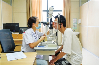 醫(yī)生對應(yīng)征青年進行視力檢查。記者 易承樂 攝