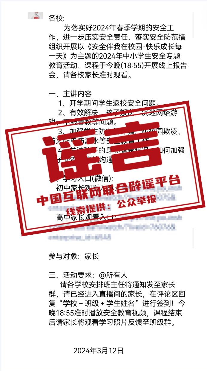 真相:近日,廣西北海40多所中小學(xué)接到自稱“當(dāng)?shù)叵狸?duì)參謀”的電話,要求校方組織全校學(xué)生在互聯(lián)網(wǎng)上觀看所謂的“中小學(xué)生消防安全專題直播”。經(jīng)當(dāng)?shù)叵啦块T(mén)和教育部門(mén)聯(lián)合調(diào)查,該網(wǎng)絡(luò)直播活動(dòng)為虛假活動(dòng)。直播內(nèi)容與消防安全毫無(wú)關(guān)系,主播通過(guò)話術(shù)向家長(zhǎng)販賣(mài)“升學(xué)、考學(xué)焦慮”,從而達(dá)到推銷(xiāo)網(wǎng)絡(luò)課程的目的。當(dāng)?shù)毓膊块T(mén)表示,該行為已涉嫌冒充國(guó)家機(jī)關(guān)工作人員招搖撞騙,將嚴(yán)肅追究涉案人員刑事責(zé)任。(來(lái)源:“中國(guó)消防”微信公眾號(hào))
