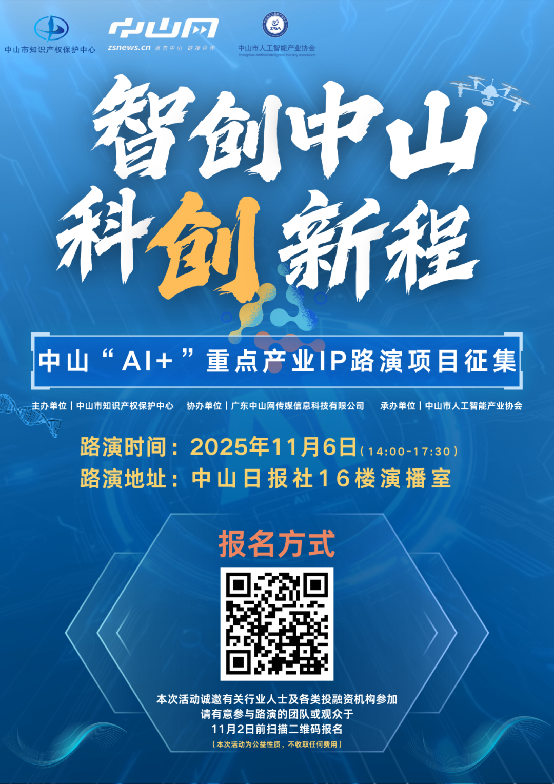 為助力我市加快培育壯大新興產(chǎn)業(yè)、前瞻布局未來產(chǎn)業(yè),推動(dòng)企業(yè)技術(shù)需求與高校、科研院所專利成果精準(zhǔn)對接,打通專利轉(zhuǎn)化關(guān)鍵環(huán)節(jié),進(jìn)一步激發(fā)創(chuàng)新活力、拓寬產(chǎn)業(yè)融資渠道,中山市知識產(chǎn)權(quán)保護(hù)中心將于11月6日(周四)舉辦中山市“AI+”低空經(jīng)濟(jì)、生物醫(yī)藥產(chǎn)業(yè)知識產(chǎn)權(quán)項(xiàng)目路演活動(dòng)。現(xiàn)面向全市各類創(chuàng)新主體,廣泛征集相關(guān)領(lǐng)域的知識產(chǎn)權(quán)路演項(xiàng)目。