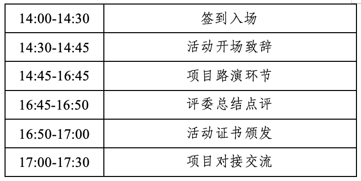 (五)活動(dòng)形式:采用線下路演模式,每個(gè)項(xiàng)目路演時(shí)長20分鐘以內(nèi)(含15分鐘項(xiàng)目展示+5分鐘評委提問環(huán)節(jié))。