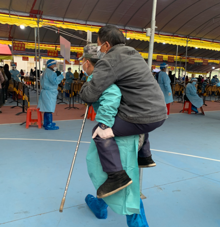 在小欖鎮(zhèn)聯(lián)豐社區(qū)核酸檢測采樣現(xiàn)場,退役軍人吳鴻文背起一位行動不便的老人前往核酸采樣工作臺,采樣結(jié)束后,將老人送出場外。臨走的時候老人連聲向他道謝。 此外,民眾街道退役軍人服務(wù)中心動員紅旗志愿服務(wù)隊退役軍人志愿者分別前往該街道18個免費(fèi)便民核酸采樣點,助力街道開展核酸檢測工作。 |
