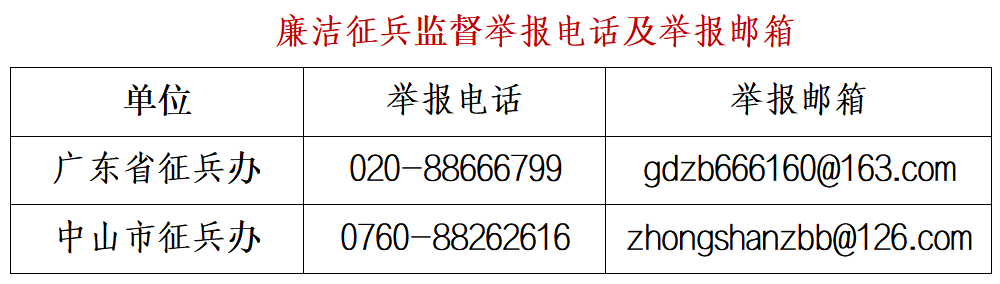 為嚴(yán)明兵員征集紀(jì)律,筑牢廉潔征兵底線,進(jìn)一步提升征兵工作透明度,中山市征兵辦將2026年我市廉潔征兵監(jiān)督員名單及監(jiān)督舉報(bào)電話、郵箱予以公布。廣大市民若發(fā)現(xiàn)征兵違法違紀(jì)線索或廉潔征兵問(wèn)題,可向廉潔征兵監(jiān)督員反映舉報(bào),也可直接撥打省、市監(jiān)督舉報(bào)電話,或發(fā)送郵件至指定信箱反饋。