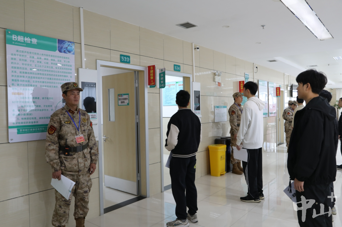 1月20日,中山市2024年上半年征兵體檢在火炬開發(fā)區(qū)人民醫(yī)院開啟,預(yù)計(jì)體檢時(shí)間將持續(xù)2周以上。 早上7時(shí)許,在火炬開發(fā)區(qū)人民醫(yī)院門診五樓,中山市征兵辦工作人員對(duì)照名冊(cè)開始人員清點(diǎn)。中山市征兵體檢隊(duì)總檢醫(yī)生李燦永介紹,此次征兵體檢面向全市所有鎮(zhèn)街,上站青年預(yù)計(jì)有1500人左右,其中大學(xué)畢業(yè)生有800人左右。當(dāng)天有100多名大學(xué)畢業(yè)生參加上站體檢,體檢項(xiàng)目有外科、內(nèi)科、心電圖等多個(gè)項(xiàng)目。 應(yīng)征青年排隊(duì)體檢。記者 王云 攝