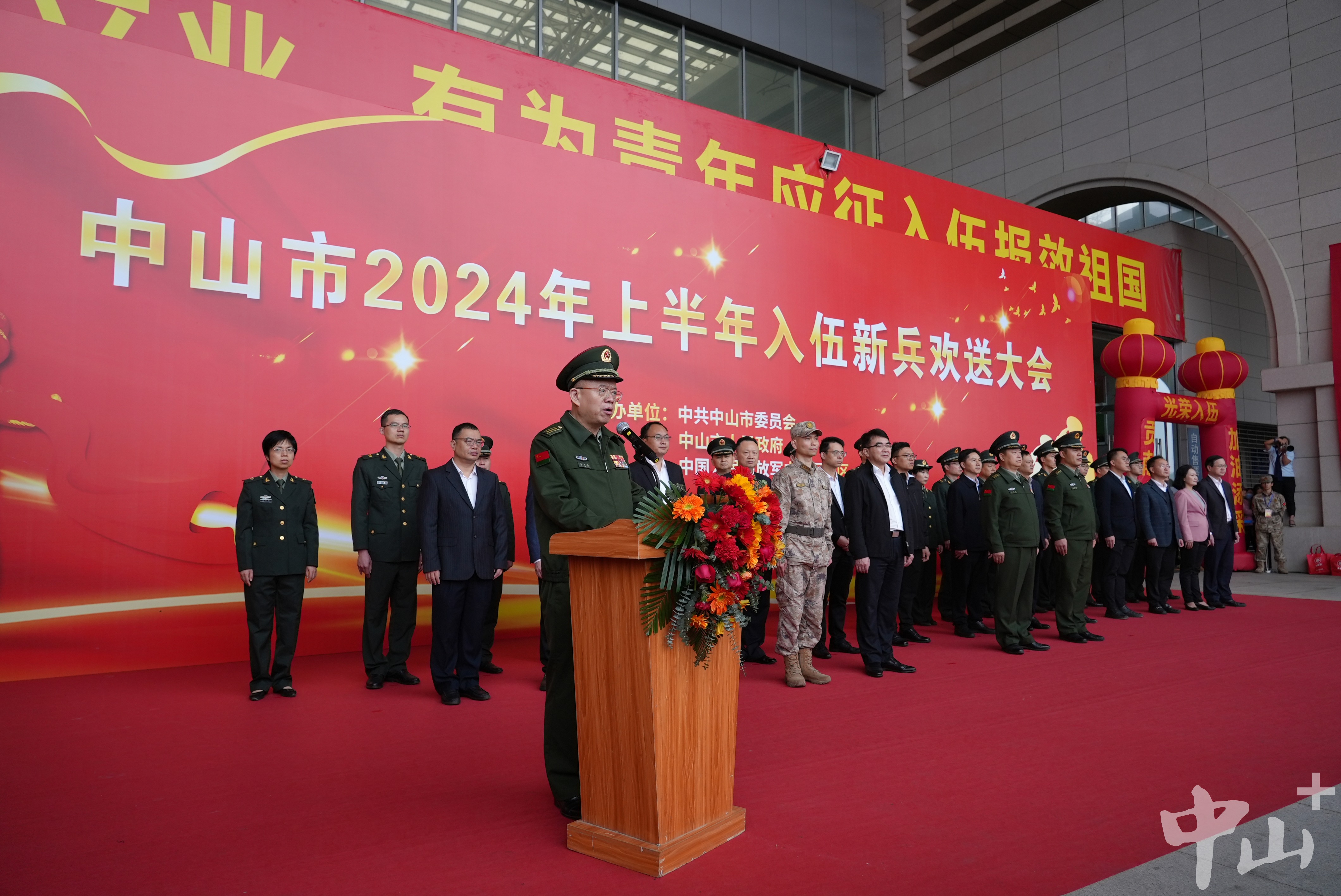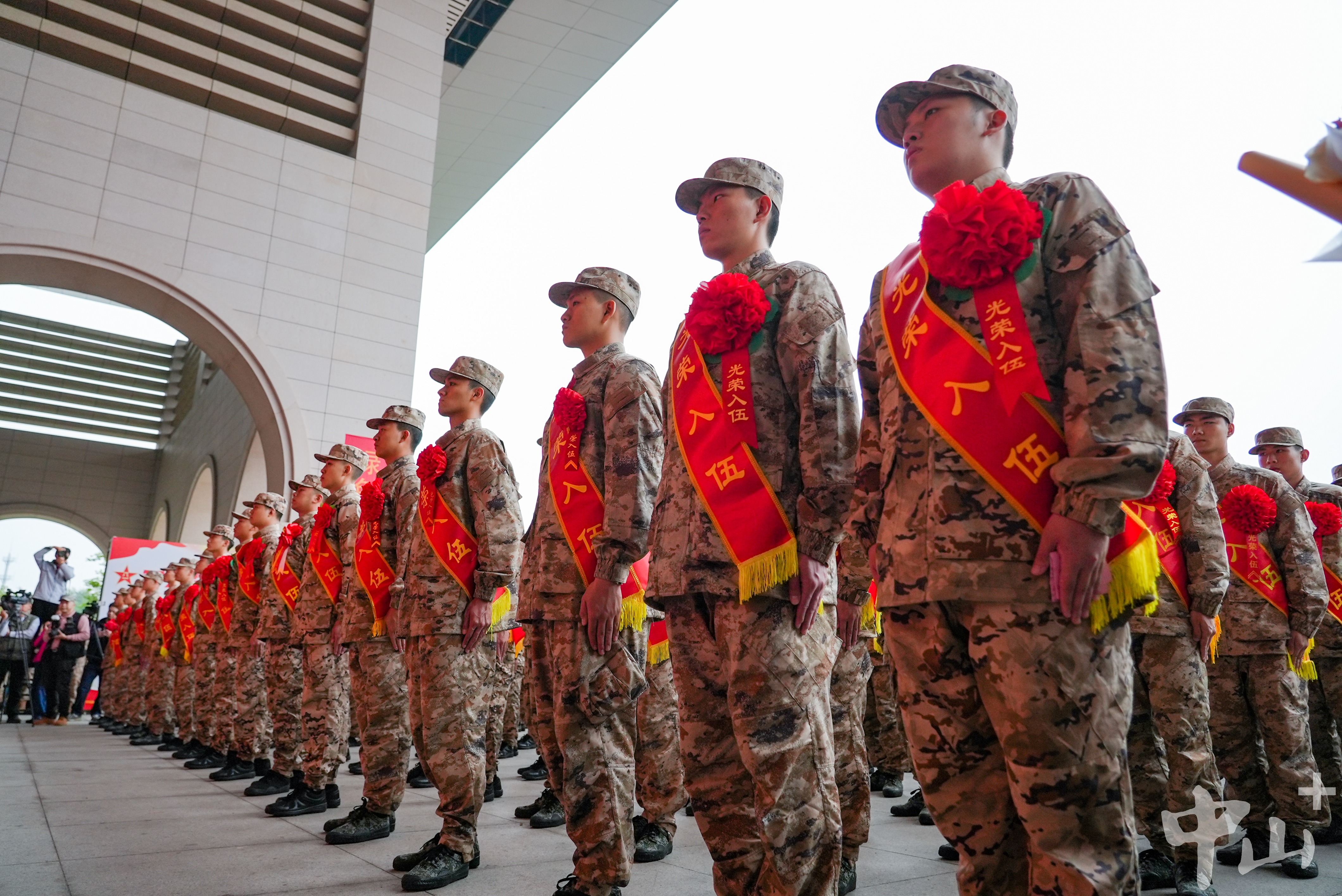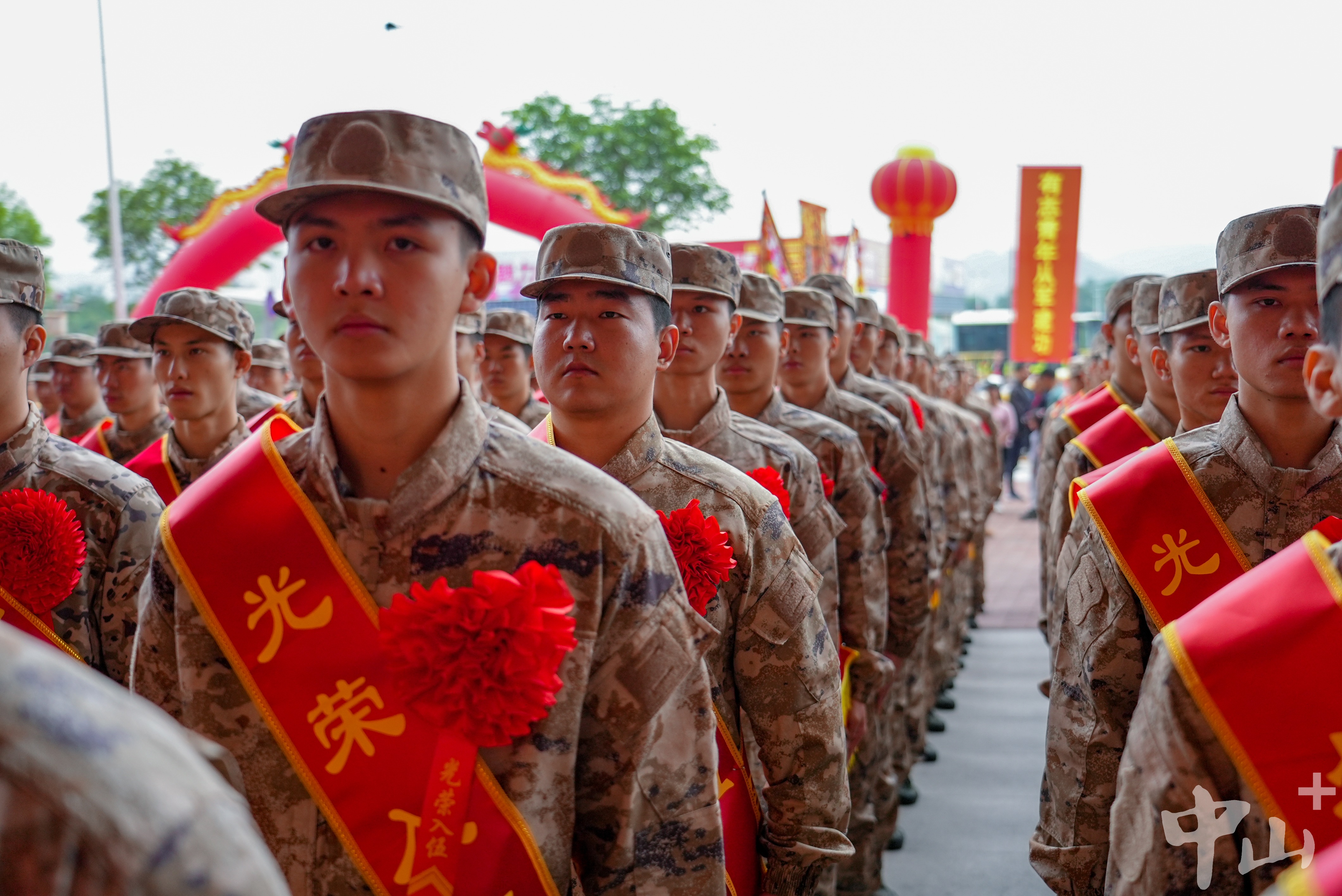 中山市征兵工作領(lǐng)導(dǎo)小組副組長、中山軍分區(qū)大校司令員李云濤,中山市征兵工作領(lǐng)導(dǎo)小組副組長、中山軍分區(qū)大校政治委員朱月明,市征兵辦副主任、市政府副秘書長梁克等出席大會。 歡送現(xiàn)場,新兵們?nèi)盅b整肅,身披“光榮入伍”的紅色綬帶,胸戴紅花,精神抖擻、軍姿挺拔。   新兵們?nèi)盅b整肅,精神抖擻、軍姿挺拔。記者 易承樂 攝