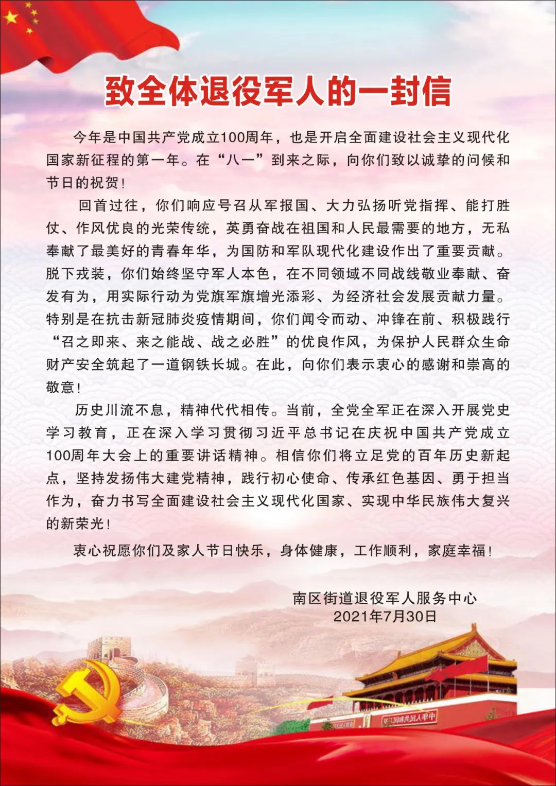 在“建軍節(jié)”來臨之際,南區(qū)街道開展一系列擁軍優(yōu)屬活動(dòng),懷著崇敬之心、感恩之心,向優(yōu)撫對象和退役軍人、現(xiàn)役軍人家屬表達(dá)關(guān)懷和謝意,推動(dòng)軍民共建!
