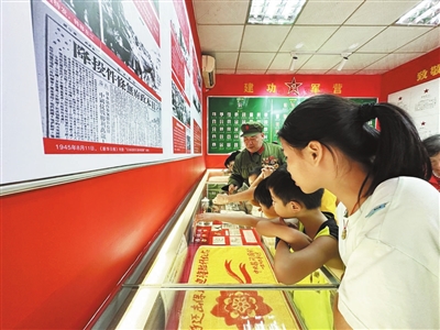 三角鎮(zhèn)老兵翁錦泉在鎮(zhèn)退役軍人服務(wù)中心榮譽室向小朋友介紹軍用物品和紀念章。