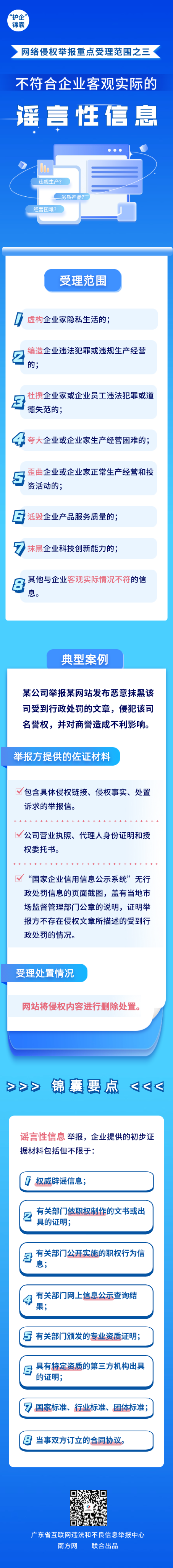 為有效助力企業(yè)維護自身網(wǎng)絡(luò)合法權(quán)益,廣東省互聯(lián)網(wǎng)違法和不良信息舉報中心精心準(zhǔn)備了“護企”錦囊,結(jié)合案例帶大家了解涉企網(wǎng)絡(luò)侵權(quán)信息的重點受理范圍,今天推出重點受理范圍之三——不符合企業(yè)客觀實際的謠言性信息。