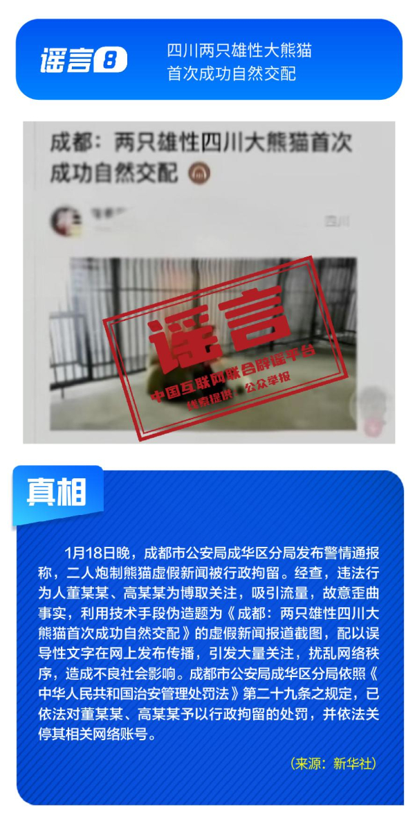 針對各類網(wǎng)絡謠言與亂象,多部門開展協(xié)同治理,聯(lián)動整治。1月16日,中央網(wǎng)信辦召開全國網(wǎng)絡辟謠聯(lián)動機制第三次全體會議,部署以辟謠工作新成效助力清朗網(wǎng)絡空間建設。中央網(wǎng)信辦聯(lián)合工業(yè)和信息化部等部門持續(xù)整治汽車行業(yè)網(wǎng)絡亂象,處置一批涉嫌挑動對立、炒作負面話題、違規(guī)測評的賬號;國家廣播電視總局開展“AI魔改”視頻專項治理,各平臺處置大量違規(guī)內(nèi)容。各地網(wǎng)信部門積極行動,陜西西安深入開展房地產(chǎn)領(lǐng)域網(wǎng)絡專項行動,處置散布樓市謠言的房產(chǎn)中介賬號,四川成都依法處置30余個惡意關(guān)聯(lián)地域、污名化城市的違規(guī)賬號。公安機關(guān)依法打擊造謠傳謠人員。擺拍“小女孩在學校跳蚤市場用50元淘到名酒”、利用AI偽造“假救護車非法轉(zhuǎn)運”、編造“兩只雄性四川大熊貓首次成功自然交配”等謠言的相關(guān)責任人已依法被予以行政處罰。