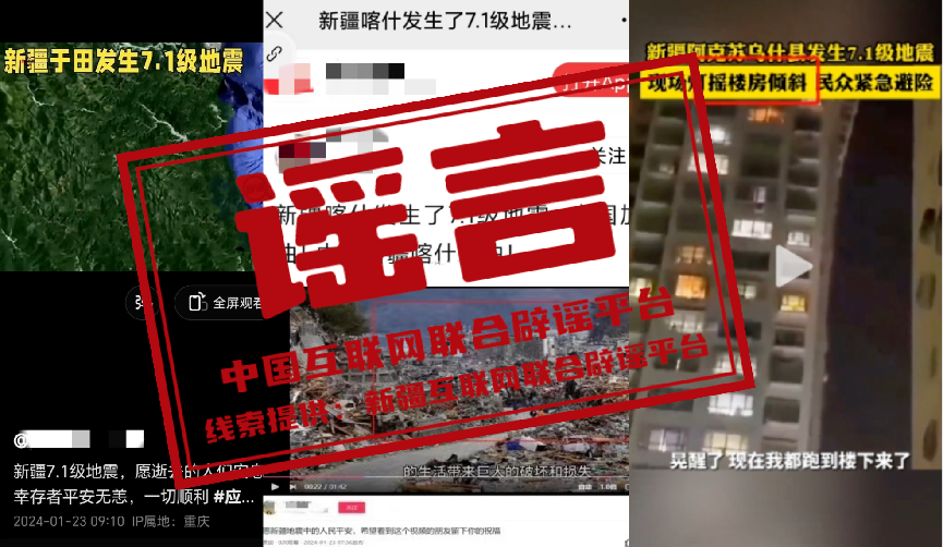 詳情:1月23日2時9分,新疆阿克蘇地區(qū)烏什縣發(fā)生7.1級地震。隨后,關(guān)于此次地震的各種不實(shí)信息在網(wǎng)絡(luò)上傳播,混淆視聽、引發(fā)關(guān)注。針對“新疆喀什發(fā)生7.1級地震”“新疆和田地區(qū)于田縣發(fā)生7.1級地震”的網(wǎng)傳信息,經(jīng)喀什市應(yīng)急管理局和于田縣應(yīng)急管理局證實(shí),1月23日兩地均未發(fā)生地震,信息為虛假不實(shí)內(nèi)容;針對“阿克蘇某小區(qū)樓被地震晃歪了”的圖文信息,經(jīng)相關(guān)部門核實(shí),圖片中的建筑物為阿克蘇市鳳凰城小區(qū)居民樓,排查暫未發(fā)現(xiàn)地震造成該樓體傾斜,網(wǎng)傳圖片系建筑物樓體設(shè)計和拍攝角度造成的樓體傾斜視覺錯誤;針對上述圖片和視頻顯示的“烏什縣路面損毀嚴(yán)重、房屋連片倒塌”相關(guān)信息,經(jīng)查是網(wǎng)民利用AI自動生成技術(shù),將烏什縣7.1級地震有關(guān)信息與網(wǎng)絡(luò)舊圖合成的虛假信息。中國互聯(lián)網(wǎng)聯(lián)合辟謠平臺提醒廣大網(wǎng)民,以官方發(fā)布信息為準(zhǔn),自覺抵制網(wǎng)絡(luò)謠言。(來源:“和田網(wǎng)絡(luò)舉報辟謠”微信公眾號、“喀什市零距離”微信公眾號、“阿克蘇網(wǎng)絡(luò)舉報”微信公眾號)