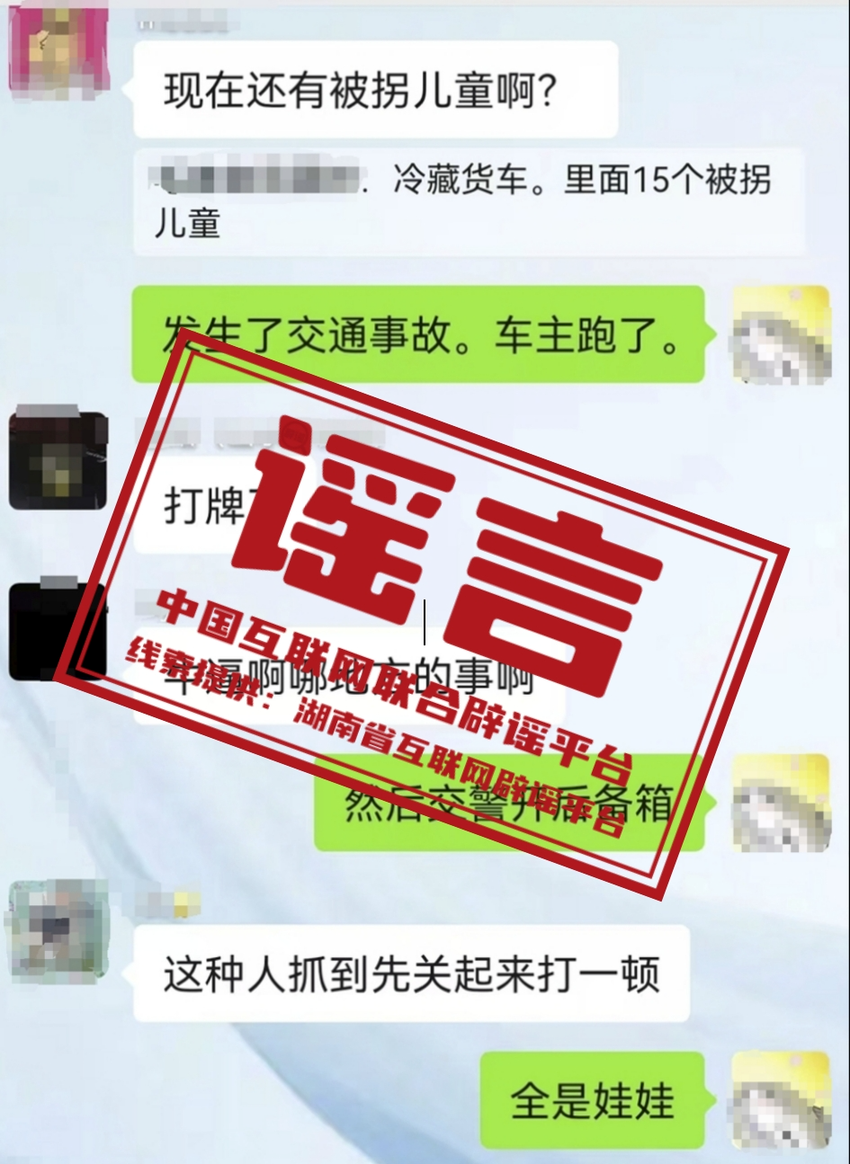 真相:9月4日,一則“湖南一冷藏車發(fā)生交通事故,交警在車上發(fā)現(xiàn)15名被拐兒童”的消息在網(wǎng)絡(luò)社交平臺(tái)傳播,引發(fā)網(wǎng)民關(guān)注。5日,湖南省湘潭市公安局雨湖分局發(fā)布警情通報(bào),“經(jīng)公安機(jī)關(guān)查證,該信息系謠言”。目前,虛構(gòu)事實(shí)擾亂公共秩序的違法行為人朱某已被公安機(jī)關(guān)依法行政拘留。(來源:“湖南省互聯(lián)網(wǎng)舉報(bào)中心”微信公眾號(hào)、“雨湖公安”微信公眾號(hào))