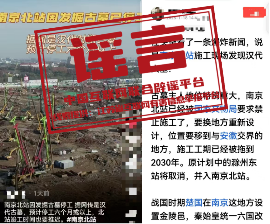 真相:近日,有網(wǎng)民在網(wǎng)絡(luò)平臺發(fā)帖稱,南京北站因挖到古墓,“已經(jīng)被國家文物局要求禁止施工了”“預(yù)計(jì)停工六個(gè)月或以上”“施工工期已經(jīng)被拖到2030年”等。經(jīng)江蘇省互聯(lián)網(wǎng)辟謠平臺與省文物部門和屬地核實(shí),目前沒有收到國家文物局關(guān)于“南京北站禁止施工”的有關(guān)通知,南京北站除個(gè)別涉及考古發(fā)掘作業(yè)區(qū)域外,其他施工作業(yè)均按計(jì)劃正常有序推進(jìn),網(wǎng)傳信息系謠言。(來源:江蘇省互聯(lián)網(wǎng)辟謠平臺、“南京網(wǎng)絡(luò)辟謠”微信公眾號)