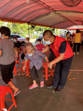 阜沙鎮(zhèn)綜合治理辦主任關(guān)國(guó)勝協(xié)助長(zhǎng)者開展核酸檢測(cè)工作。